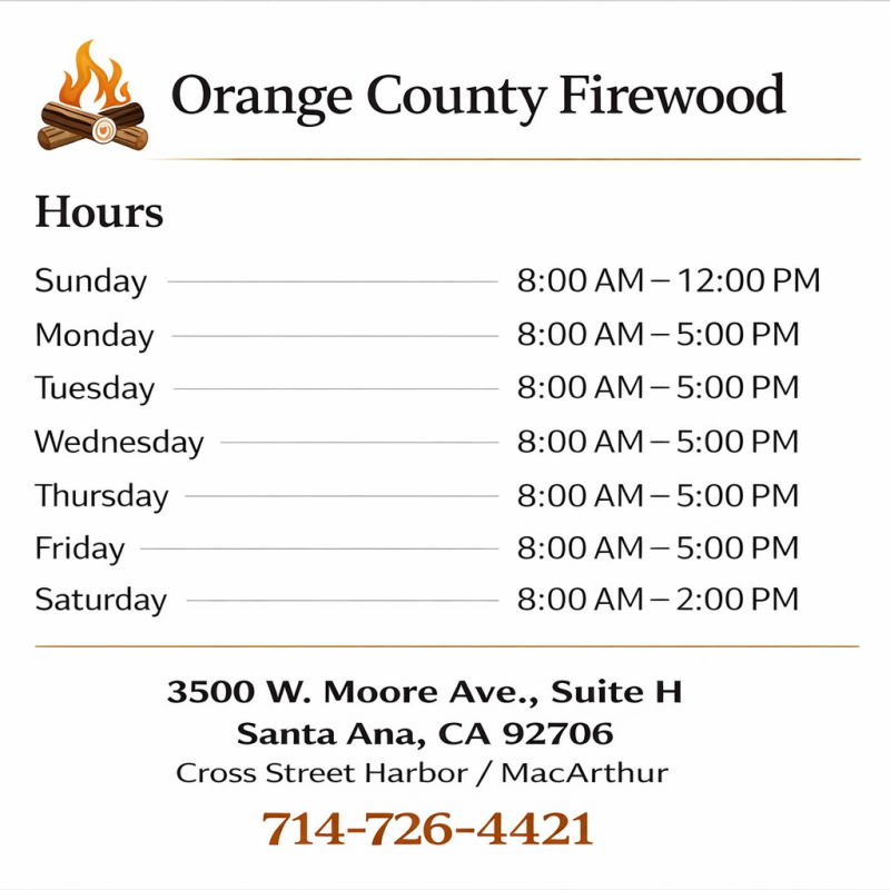We proudly deliver firewood across Orange County, including Santa Ana, Irvine, Newport Beach, Huntington Beach, Costa Mesa, Anaheim, Orange, Tustin, Garden Grove, and surrounding areas.
