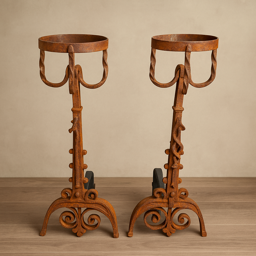 Antique Wrought Iron Andirons – Ornate Design with Natural Patina