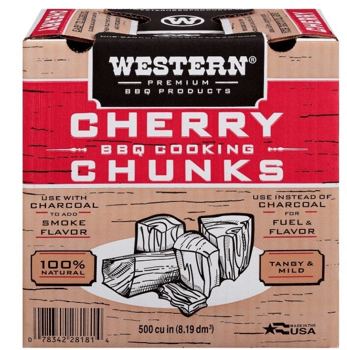 Western Premium BBQ Products Cherry BBQ cooking chunks, 500 CU in (0.289 cubic foot) produces a mild smoke with a tangy, fruity flavor and are made with 100% real cherry wood. They complement lighter meats like chicken and fish, and add a beautiful reddish tone to sausages, poultry and salmon. You can use these wood chunks with or instead of charcoal, with kettle grills, ceramic grills or smokers.